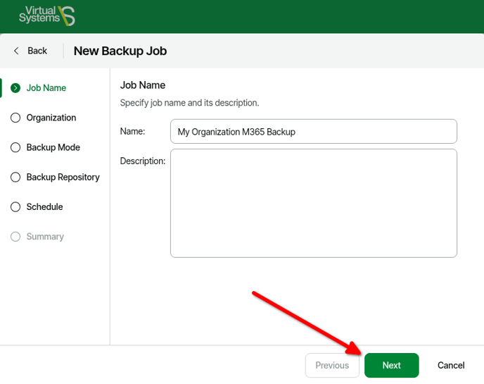 - On the Job Name page, enter a Name for the Microsoft 365 and optionally a Description for the M365 Backup Job > click Next.