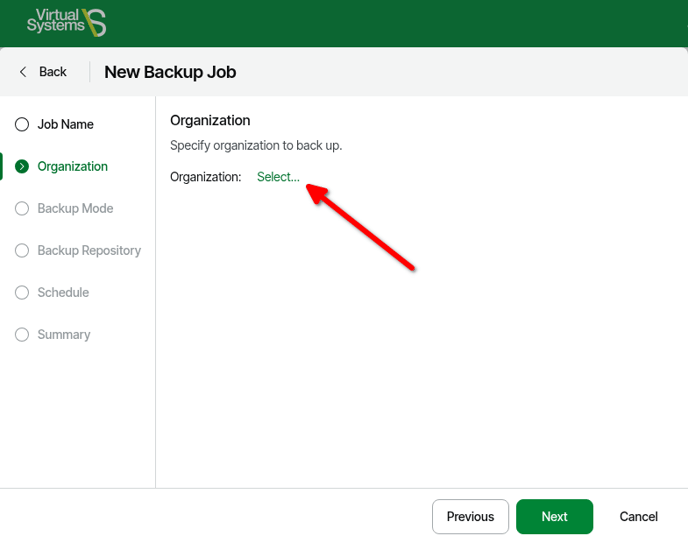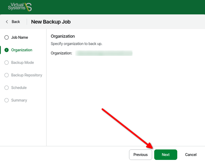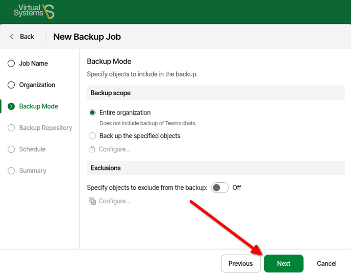 - On the Backup Mode page, you can choose Entire organization to back up everything. Note that this will still only backup the M365 services that were selected when the organization was added.