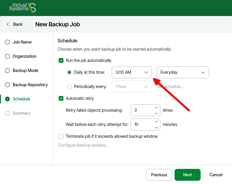 - In the Automatic retry section, define whether Veeam Backup for Microsoft 365 must attempt to run the backup job again if the job fails for some reason. Type the number of attempts to run the job and define time intervals between them.
