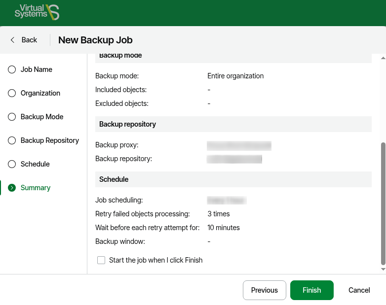 - On the Summary page, optionally, check Start the job when I click Finish to start the initial backup > click Finish.