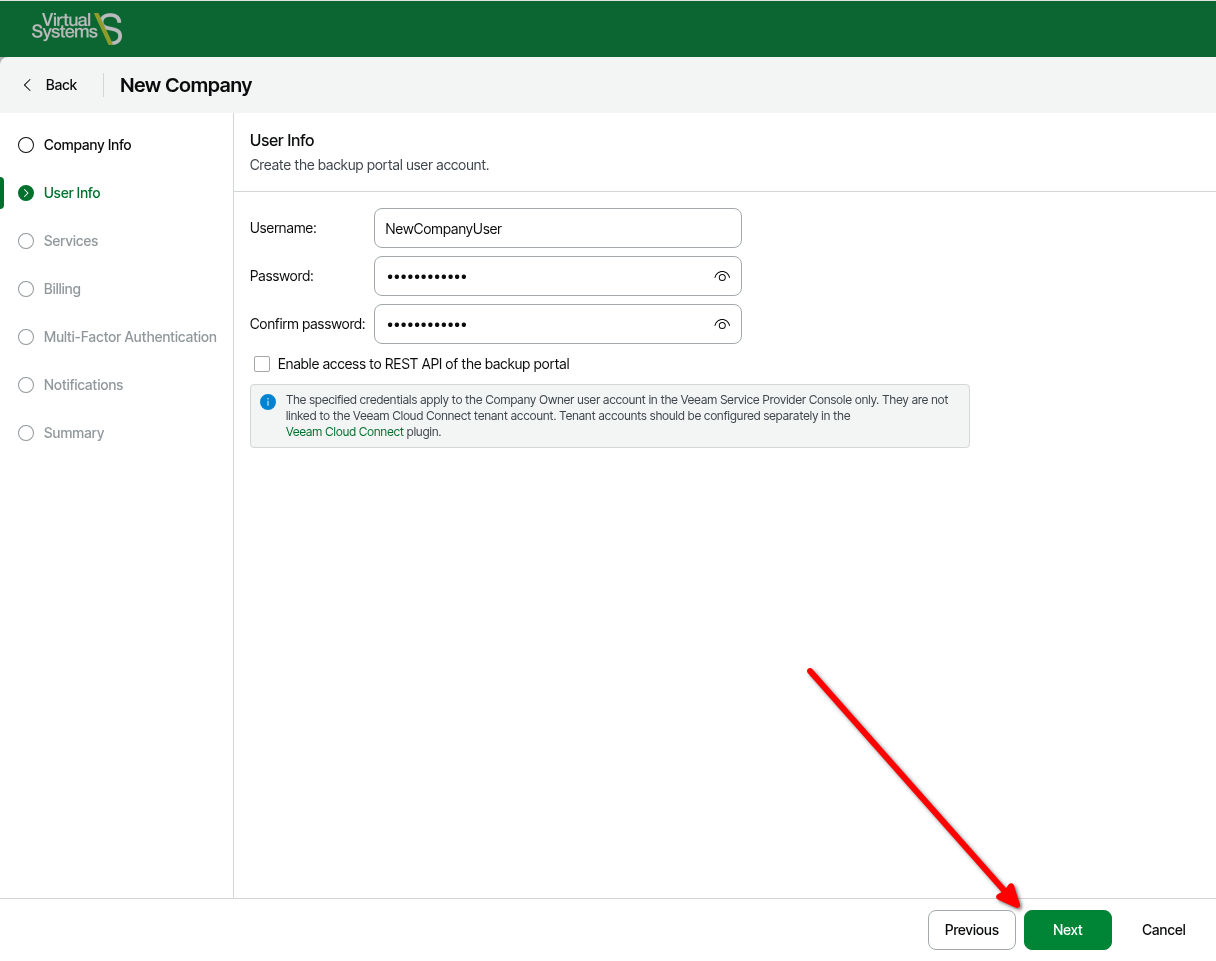 - On the User Info page, enter the username and password the tenant will use to connect to the service provider in the tenant's Veeam Backup and Replication console.