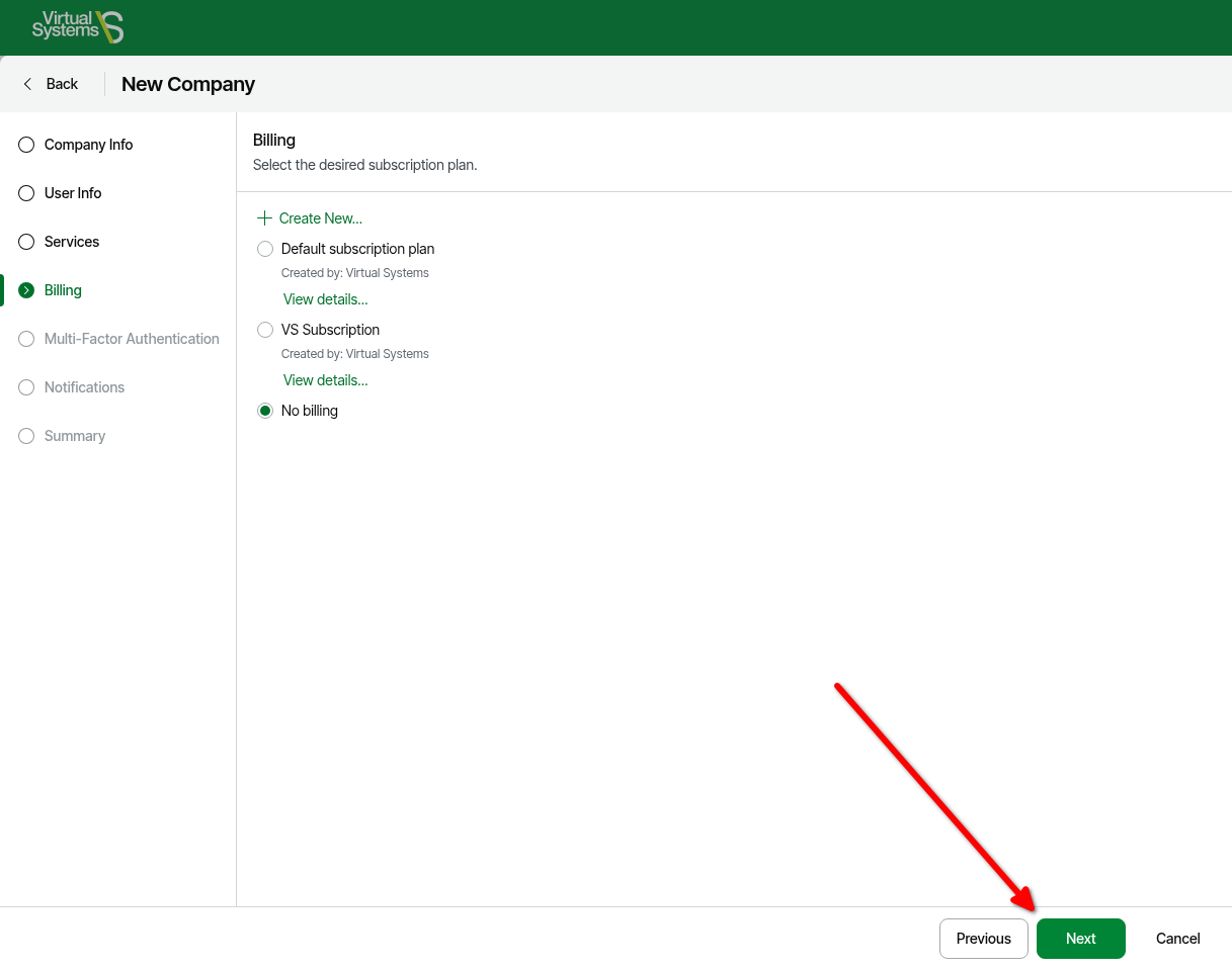 - On the Billing page, select a Billing subscription plan or No billing depending on if it is desired to use VSPC to send customer invoices > click Next.