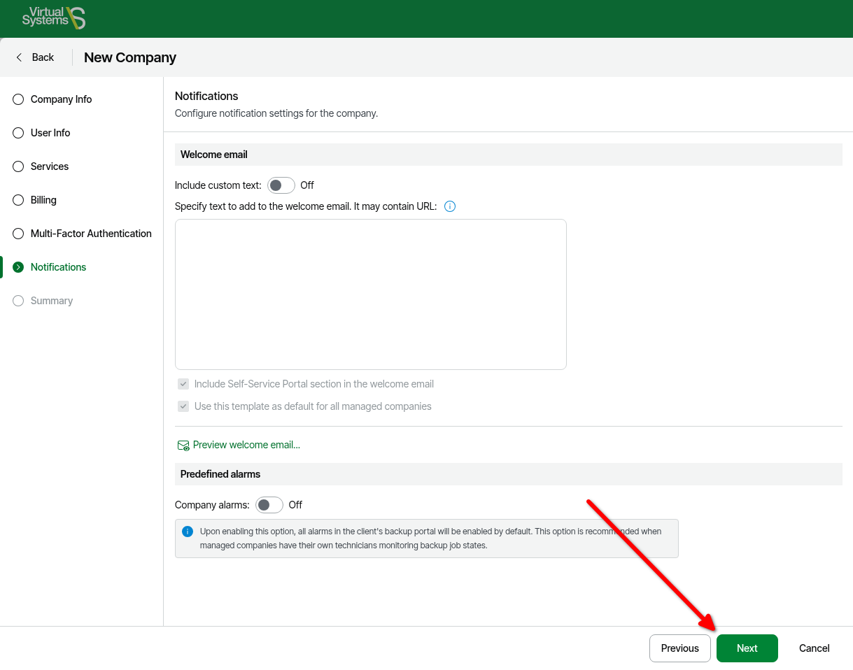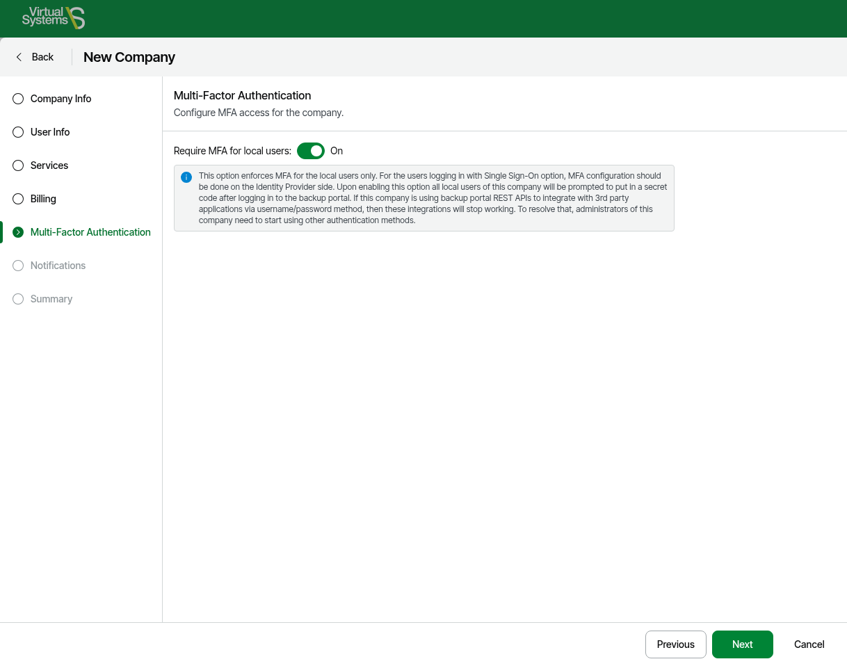 - On the Multi-Factor Authentication page, it is recommended to enable MFA for the company to log into the VSPC portal > click Next.