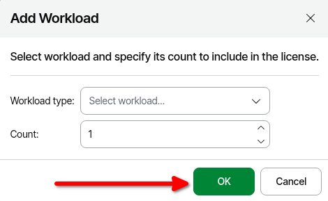 - In the Workload type drop down list, select what the customer needs to protect and provide the Count of those workloads. Note that up to 20% over the workload count is acceptable. You will be billed for this count if reporting is not enabled through Cloud Connect. Click OK.