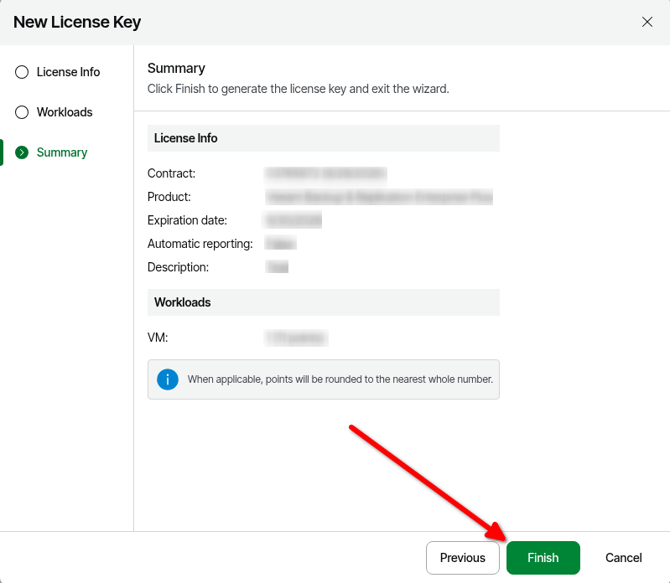 - In the New License Key window Summary section, review the page for accuracy > click Finish.