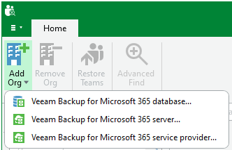 - The Veeam Explorer for Microsoft Teams browser opens. On the Home tab, click on Add Org > click on Veeam Backup for Microsoft 365 Service provider...