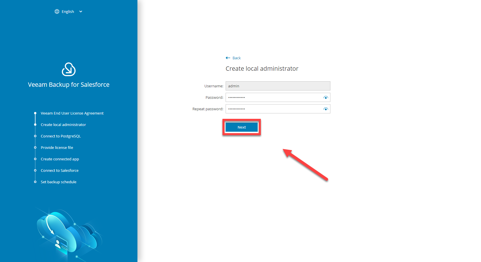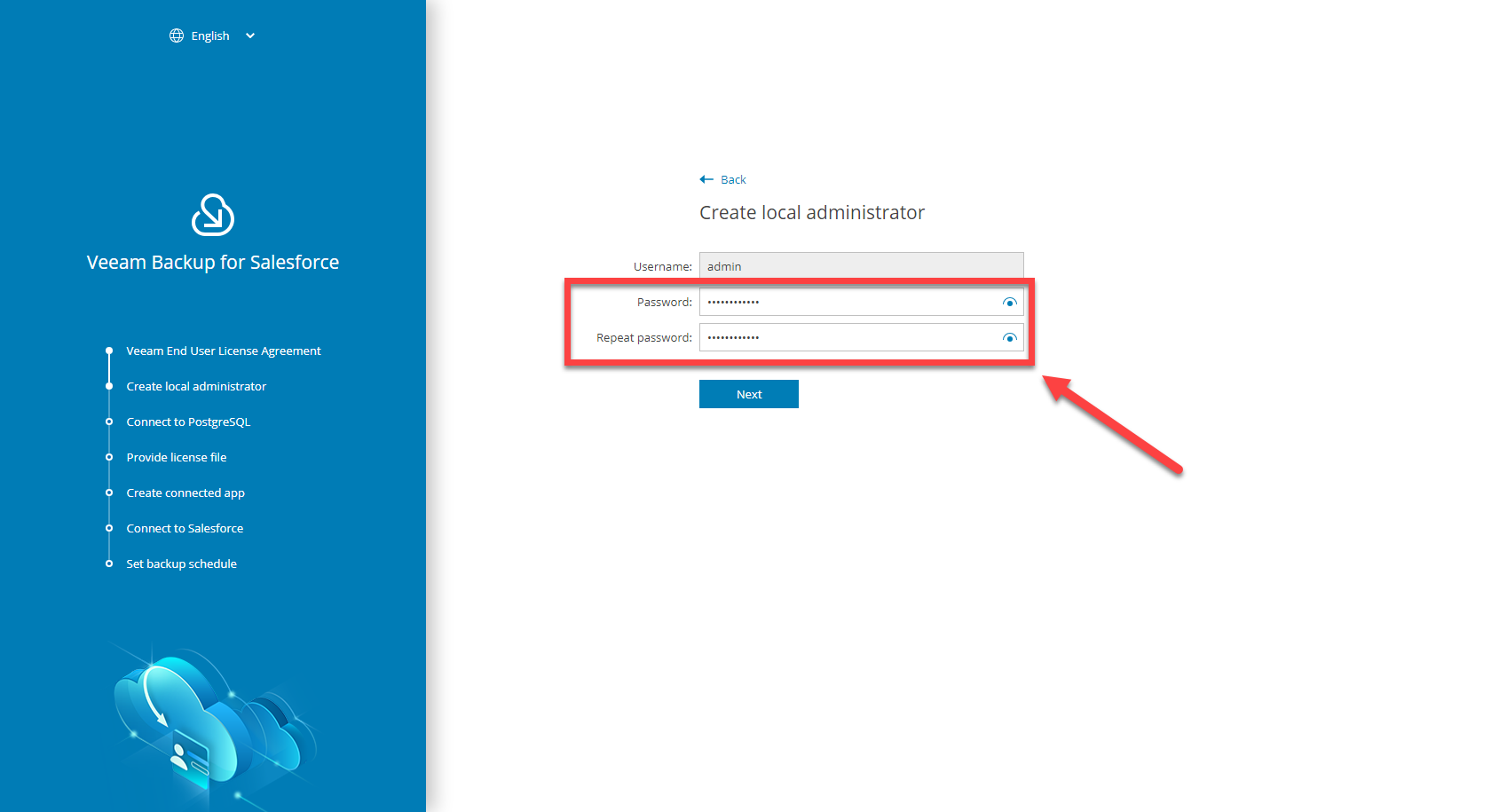 - On the Create local administrator step, enter a strong password in the Password and Repeat password fields.