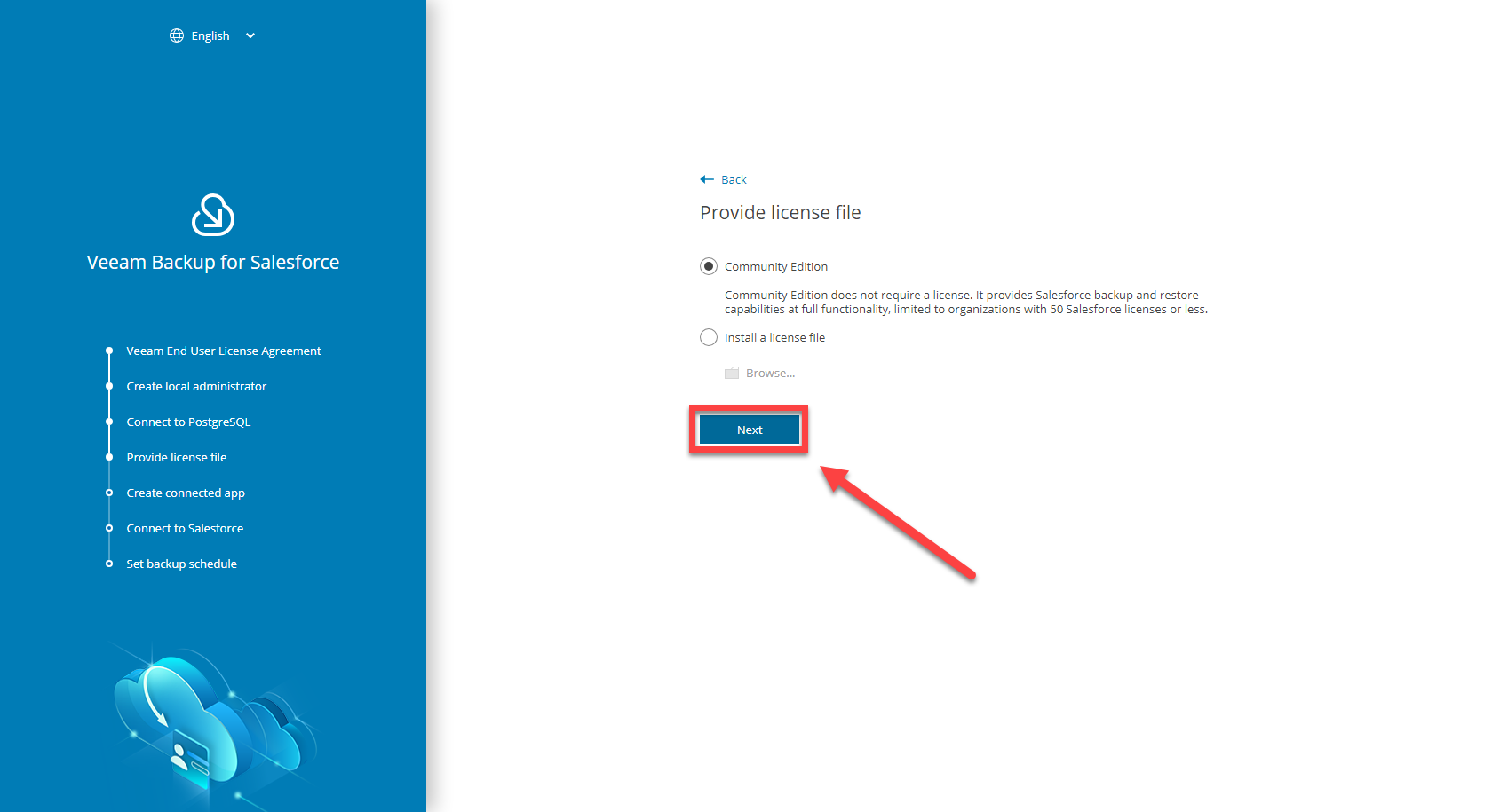 - On the Provide license file step, ensure Community Edition is selected and click Next.