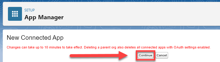 17. Take note of the message warning to allow up to 10 minutes for settings to become active and click Continue.