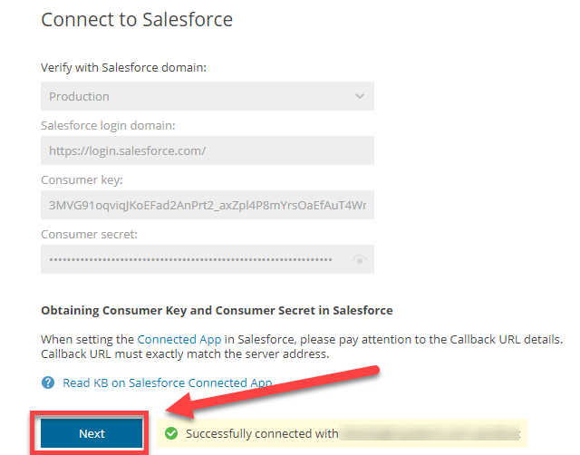 21. Go back to the Veeam Backup for Salesforce browser tab. On the Create connected app step, provide the Consumer key and Consumer secret retrieved from Salesforce and click Connect. If you get an error, verify the correct Consumer Key and Consumer Secret was used and it has been at least 10 minutes since the App was created in Salesforce.