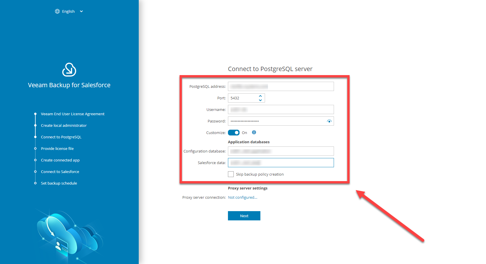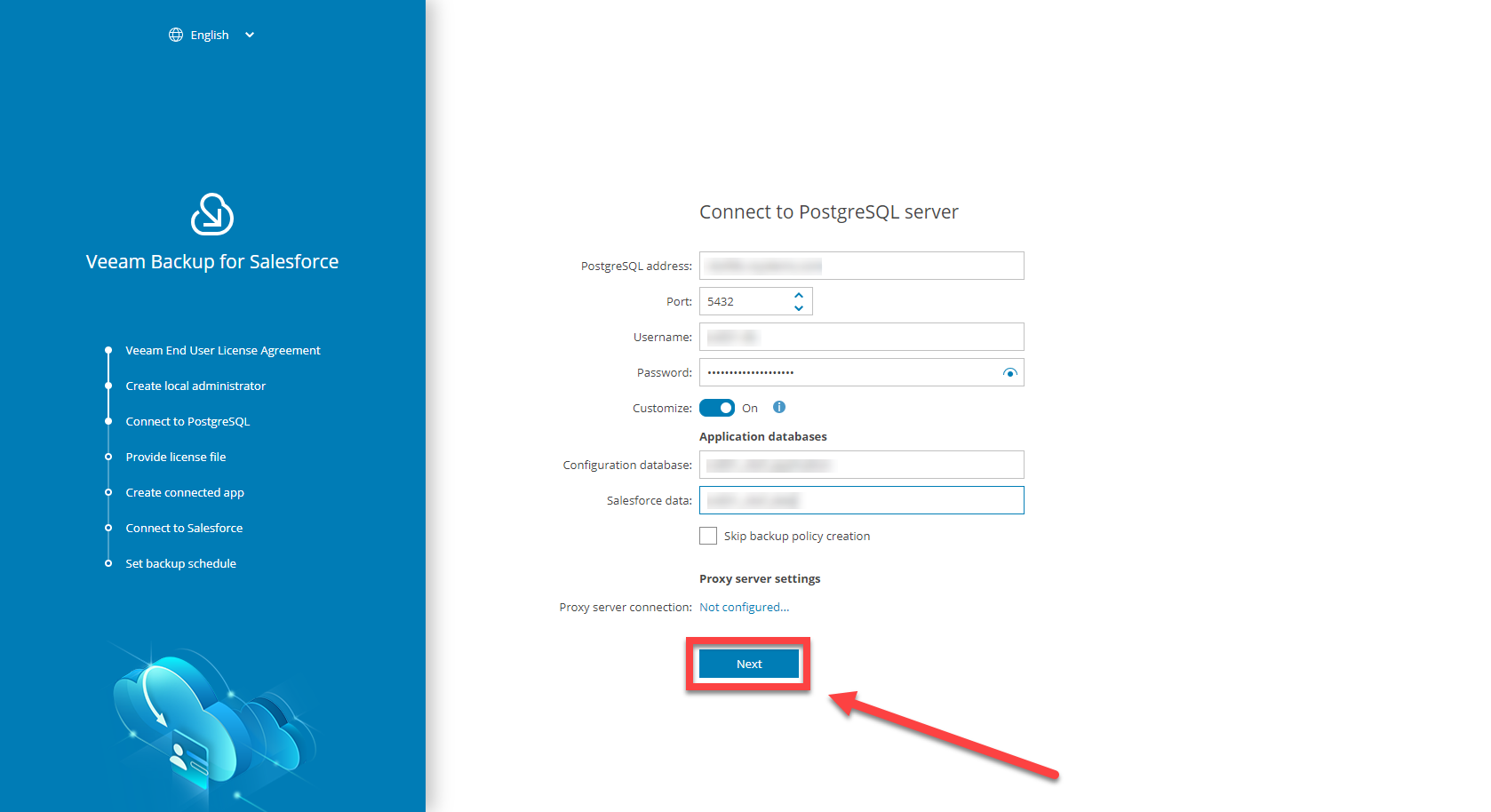 - Now, fill in the PostgreSQL address, Port, Username, Password, Configuration database, and Salesforce data fields with the information provided in the "Your Hosted Salesforce Backup Trial is Ready!" email.